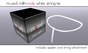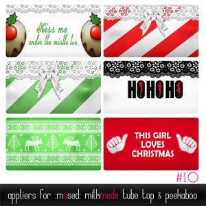 Christmas is coming, so we have released a pack of fun textures for the :mused: milk made peekaboo and tube top. This pack can be purchased in the :mused: store for 3L of milk. There is also a new white string tie to pair with your starter tops. This comes with a new white attachment and the applier object needed to change the strings on your breasts.