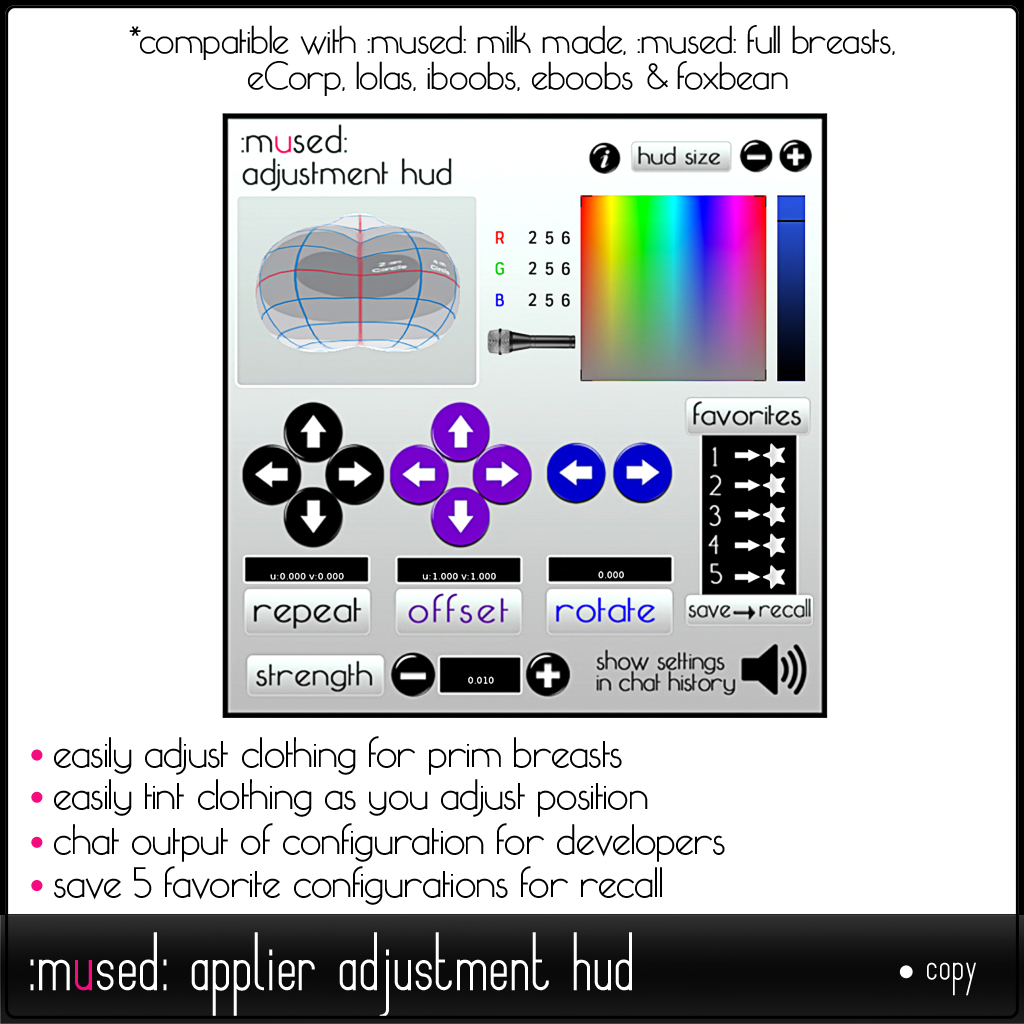 While made by :mused: this HUD supports a number of different appliers and is compatible with eCorp, Lolas, iboobs, eboobs, and foxbean as well as standard :mused: appliers.