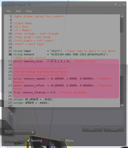 To create an applier with your texture you will need to rez a copy of the applier that you got in the developer kit and open the script inside that is called _config_5d. You will see something that looks like this: