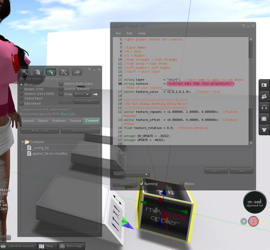 After you have saved the script with the updated positioning for the texture use the applier again to be sure that everything looks right and if not make any changed you need to make in the same way. Once you are satisfied with the placement of the texture change the name of the applier object so you will know what outfit it is for and take it back into your inventory.