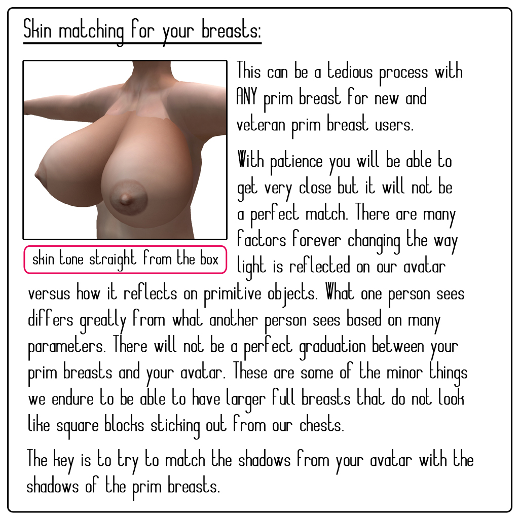 The post we have to day has been put together by Madeea. It is in fact part of the older Full Breast manual before we went to the web version for ease of updating information. While the pictures are all based on the Full Breasts the instructions and advice are useful for matching any prim breasts or any attachment really. I have included the intructions in the images in text below it for easier translation via web tools for those who do not speak English natively.page 11Skin matching for your breasts: This can be a tedious process with any prim breast for new and veteran prim breast users. (skin tone shown as it comes out of the box not yet altered) With patience you will be able to get very close but it will not be a perfect match. There are many factors forever changing the way light is reflected on our avatar versus how it reflects on primitive objects. (like the breasts) What one person sees differs greatly from what another person sees based on many parameters. (such as graphics settings) There will not be a perfect graduation between your prim breast and your avatar. These are some of the minor things we endure to be able to have larger full breasts that do not look like square blocks sticking out from our chests. (for more help on managing that line see Skye’s post on smoothing the transition.)