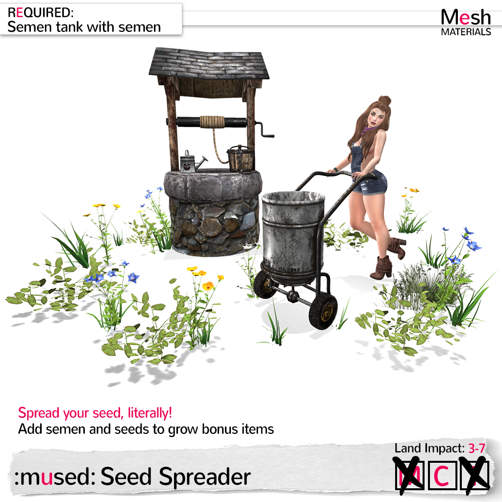 The seed spreader allows you to take seeds, fertilize them with semen and then grow your own bonuses! This is a vehicle that will allow you to push it and spread your seed on your land. You can also allow farm hands to help you tend your garden. Grow your seeds to maturity to find out what bonus you have! A variety of bonuses can be grown and shared with your family and friends. Included is a set of garden beds that you can customize and configure for your plants.