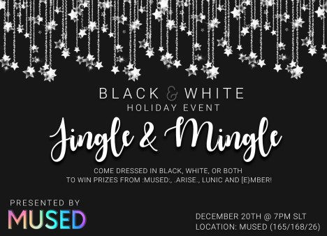 Join us for the Jingle & Mingle event tomorrow night at 7pm SLT! Drinking Contests plus Best Dressed in Black & White prizes! Hope to see you there!!